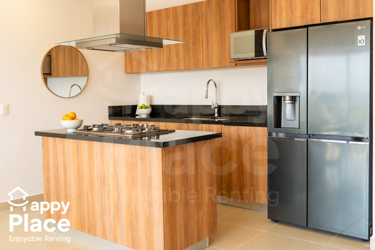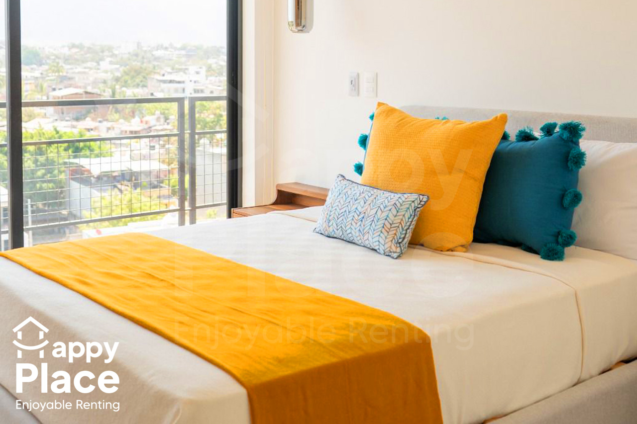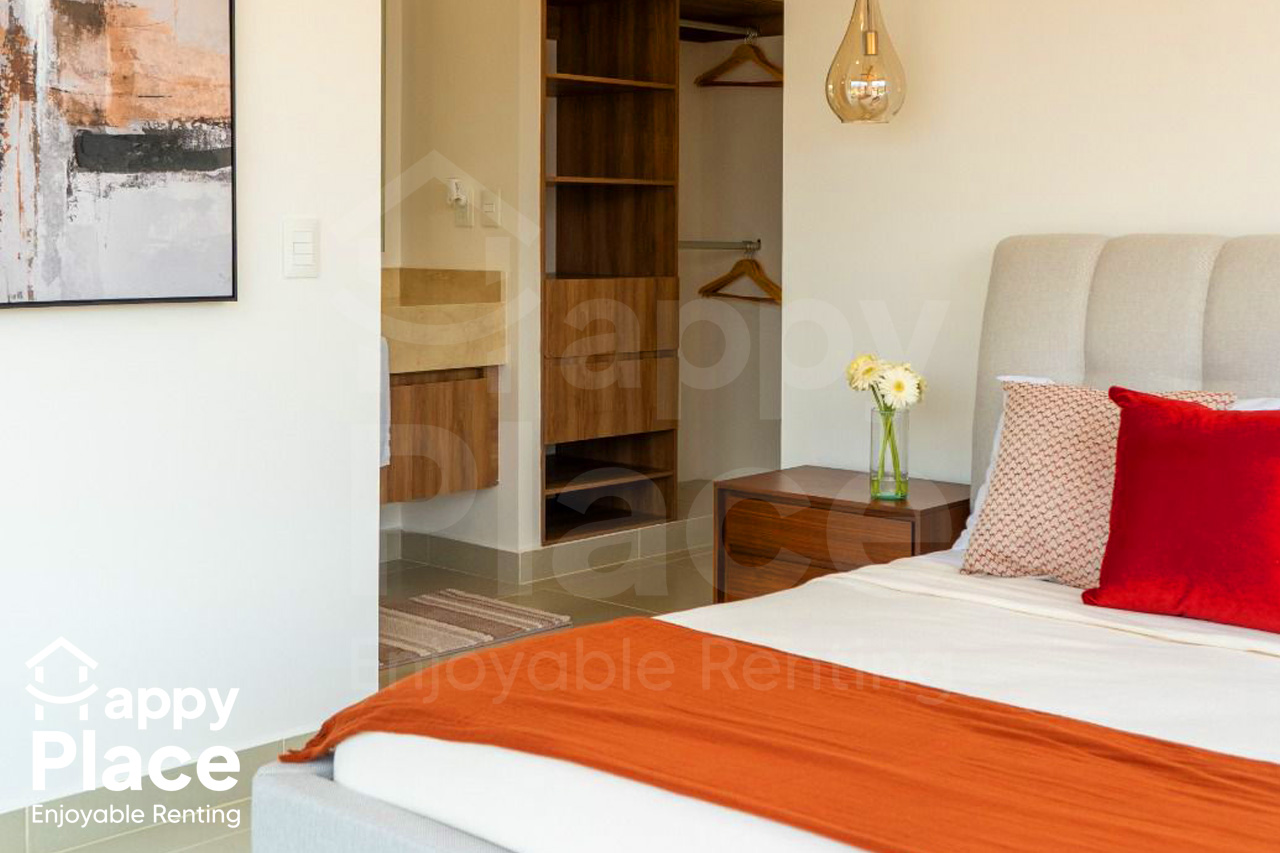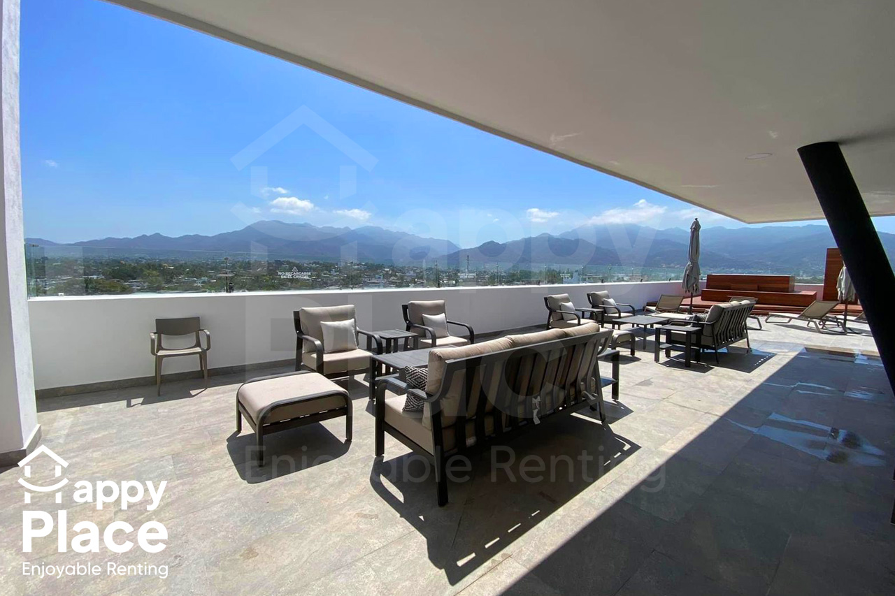 El departamento esta amueblado y equipado con 2 recamaras y 2 baños. La recamara principal tiene baño y closet con acceso a la terraza, la recamara secundaria tiene closet.