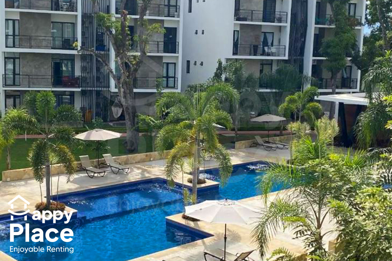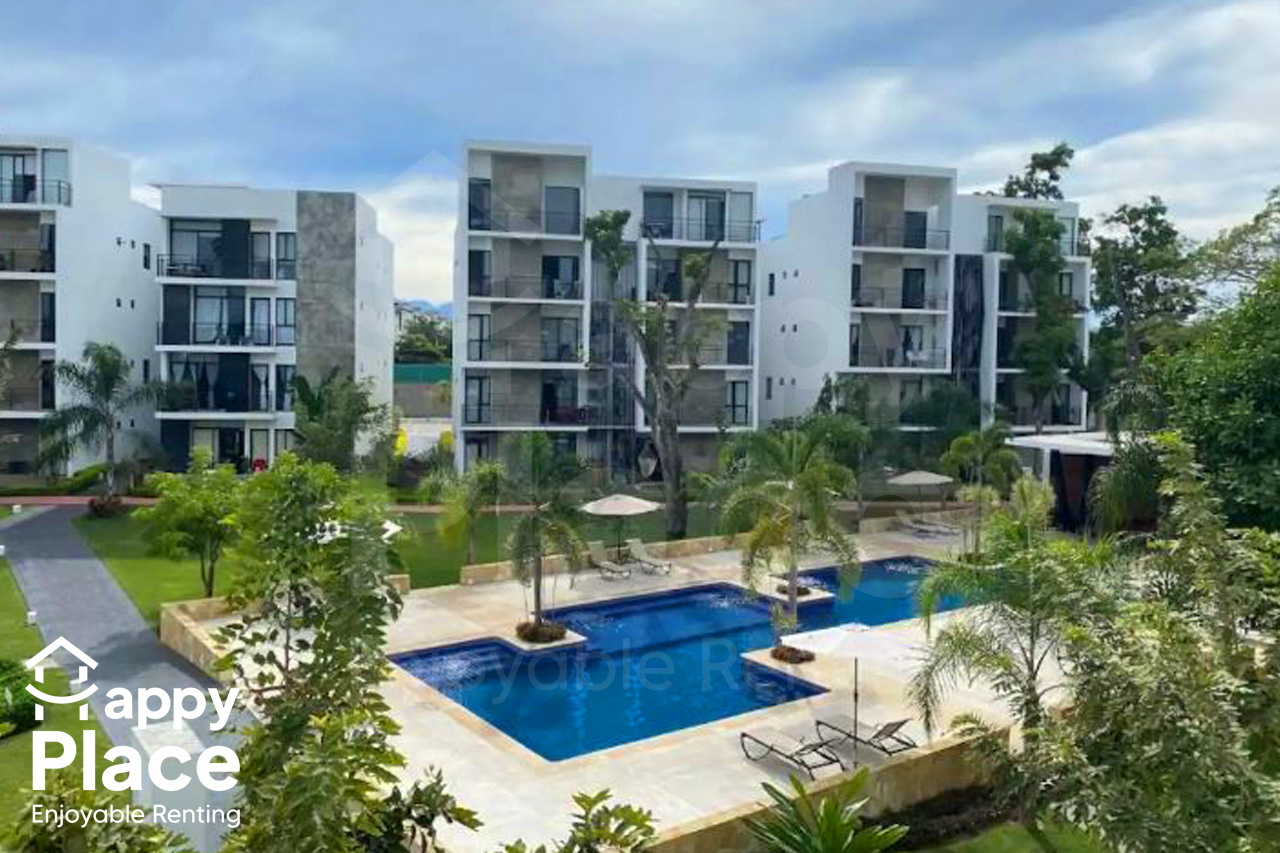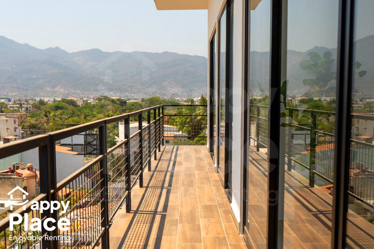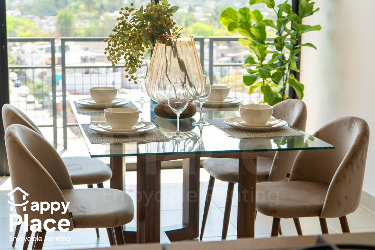 El departamento esta amueblado y equipado con 2 recamaras y 2 baños. La recamara principal tiene baño y closet con acceso a la terraza, la recamara secundaria tiene closet.