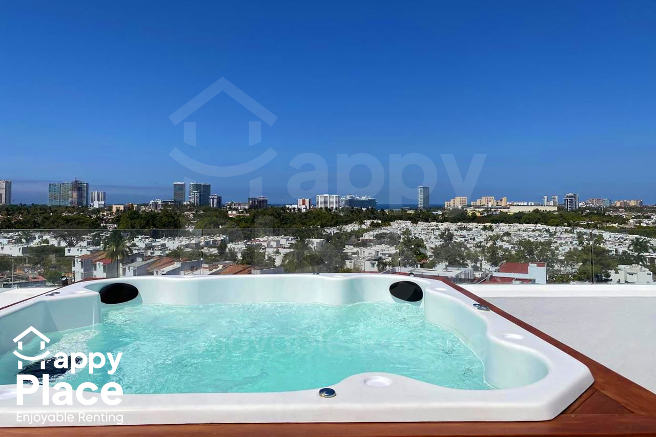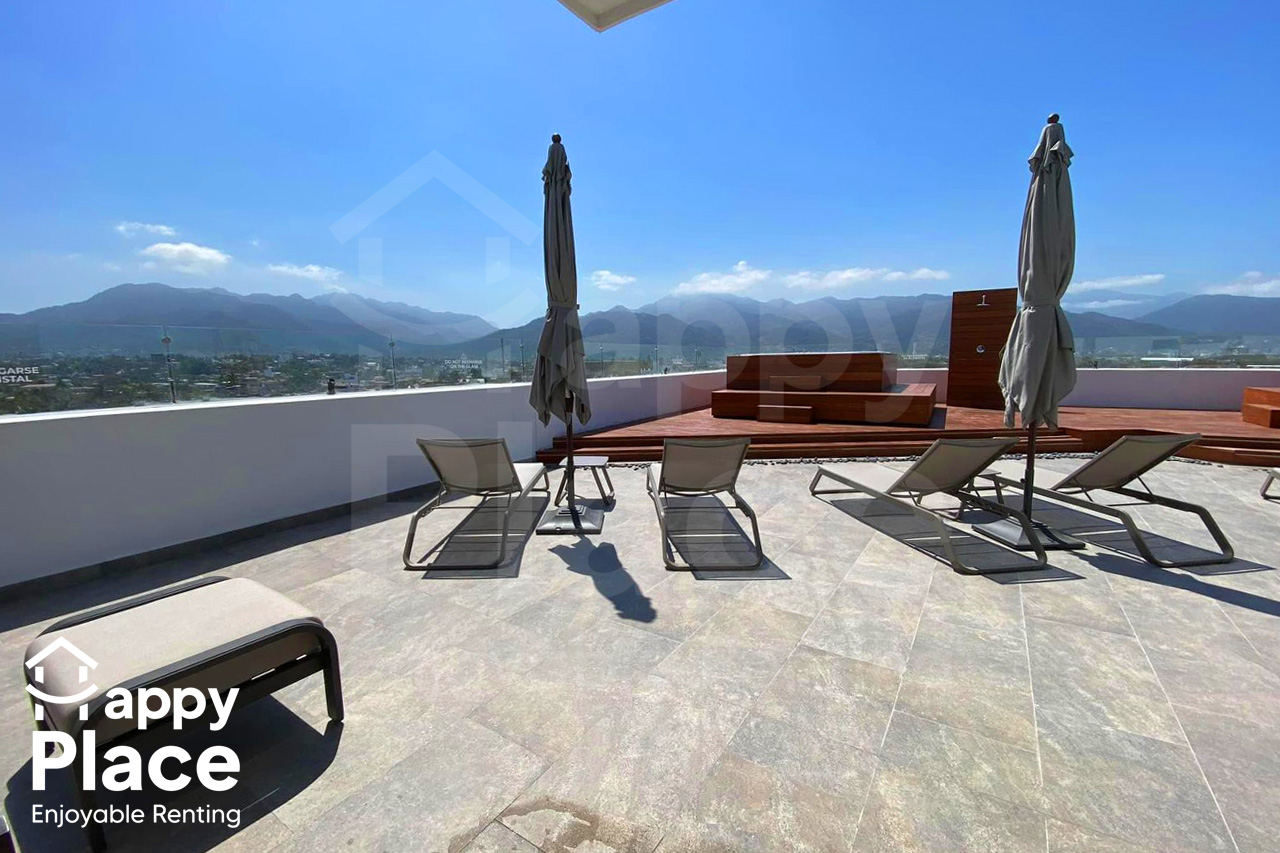 En el rooftop se encuentra el área lounge, el gimnasio, una terraza con asoleaderos, baños, 2 jacuzzis, la torre tiene 2 elevadores para su uso