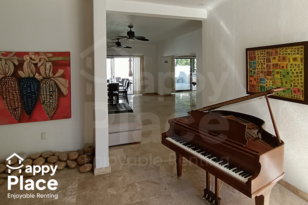 EN LA SALA SE ENCUENTRA UN PIANO LA CASA TIENE 2 CAMAS KING SIZE, 1 CAMA QUEEN, 2 CAMAS MATRIMONIALES, 1 INDIVIDUAL, 1 SOFA CAMA DOBLE INDIVIDUAL
